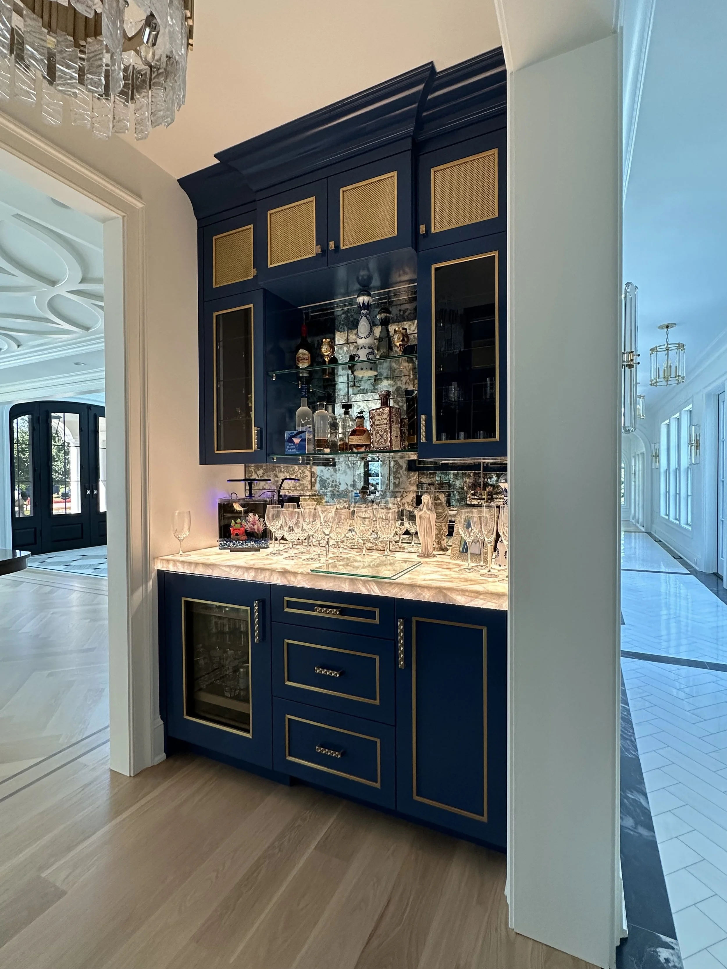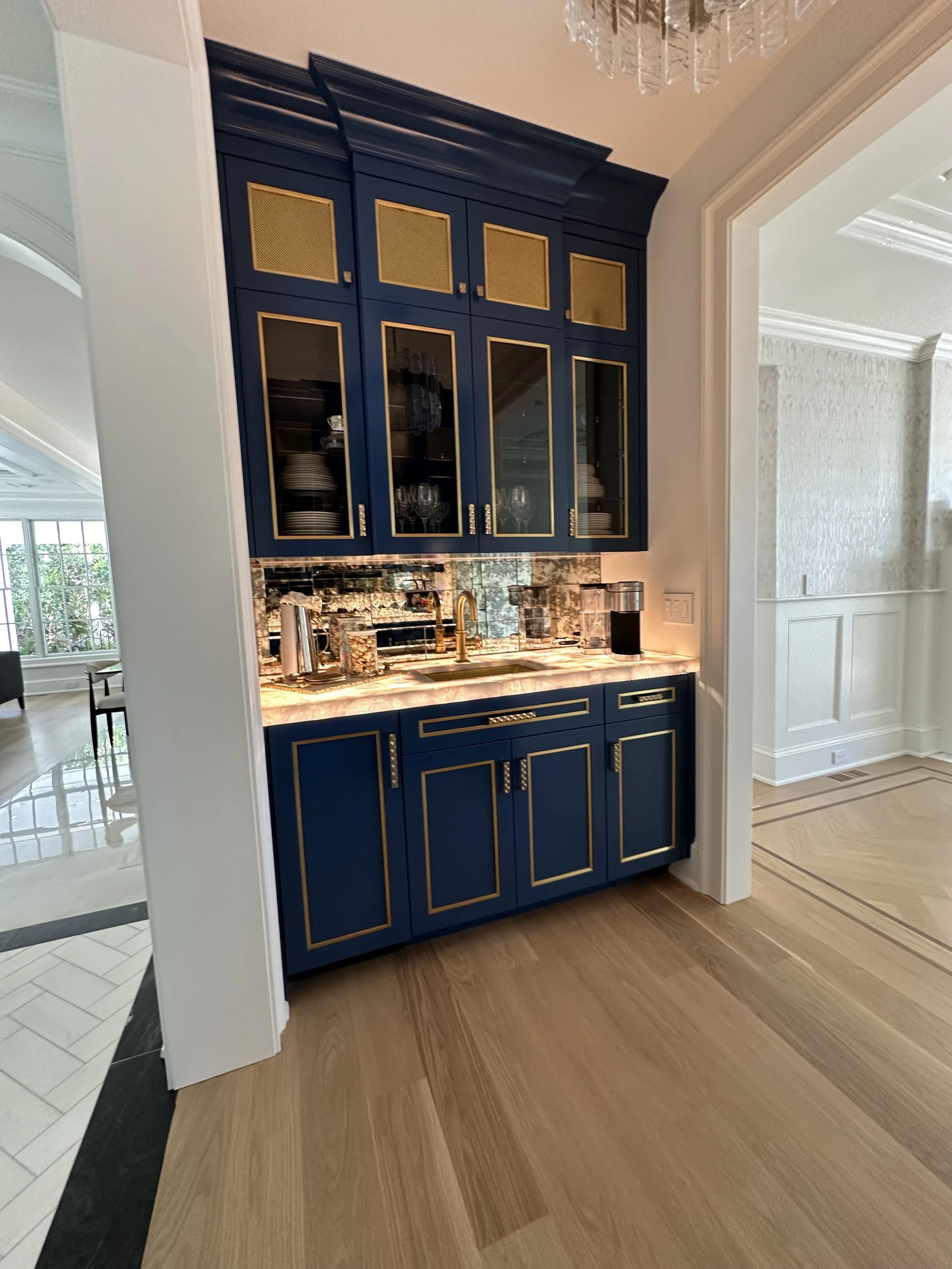 A Garden City butler’s pantry designed with intention. Custom blue cabinetry, warm brass detailing, and a backlit Crystallis marble backsplash transform this functional space into an elevated moment for effortless entertaining.