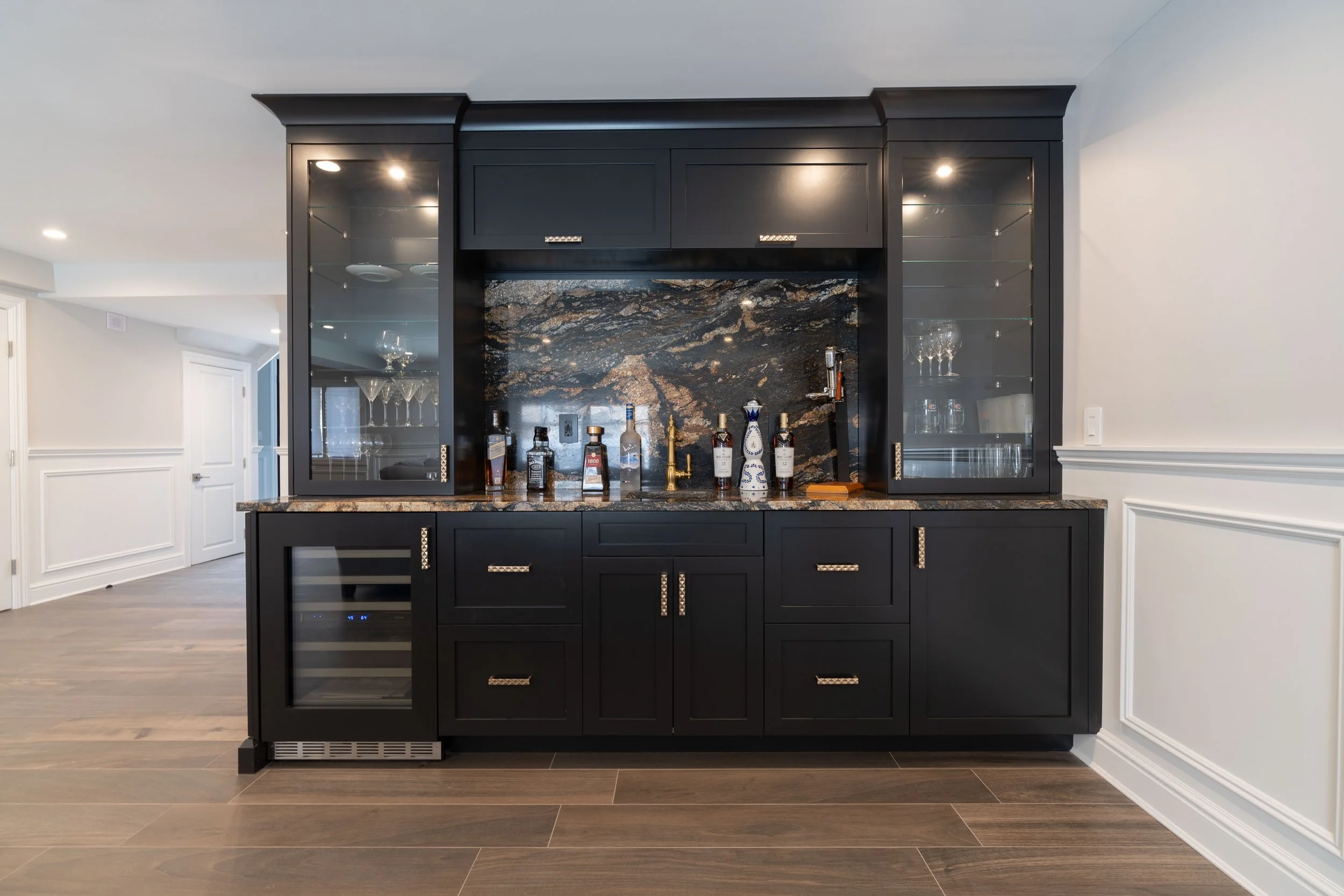 A custom home bar in Howard Beach designed with intention, where dramatic stone, tailored cabinetry, and curated details create an elegant space for entertaining.