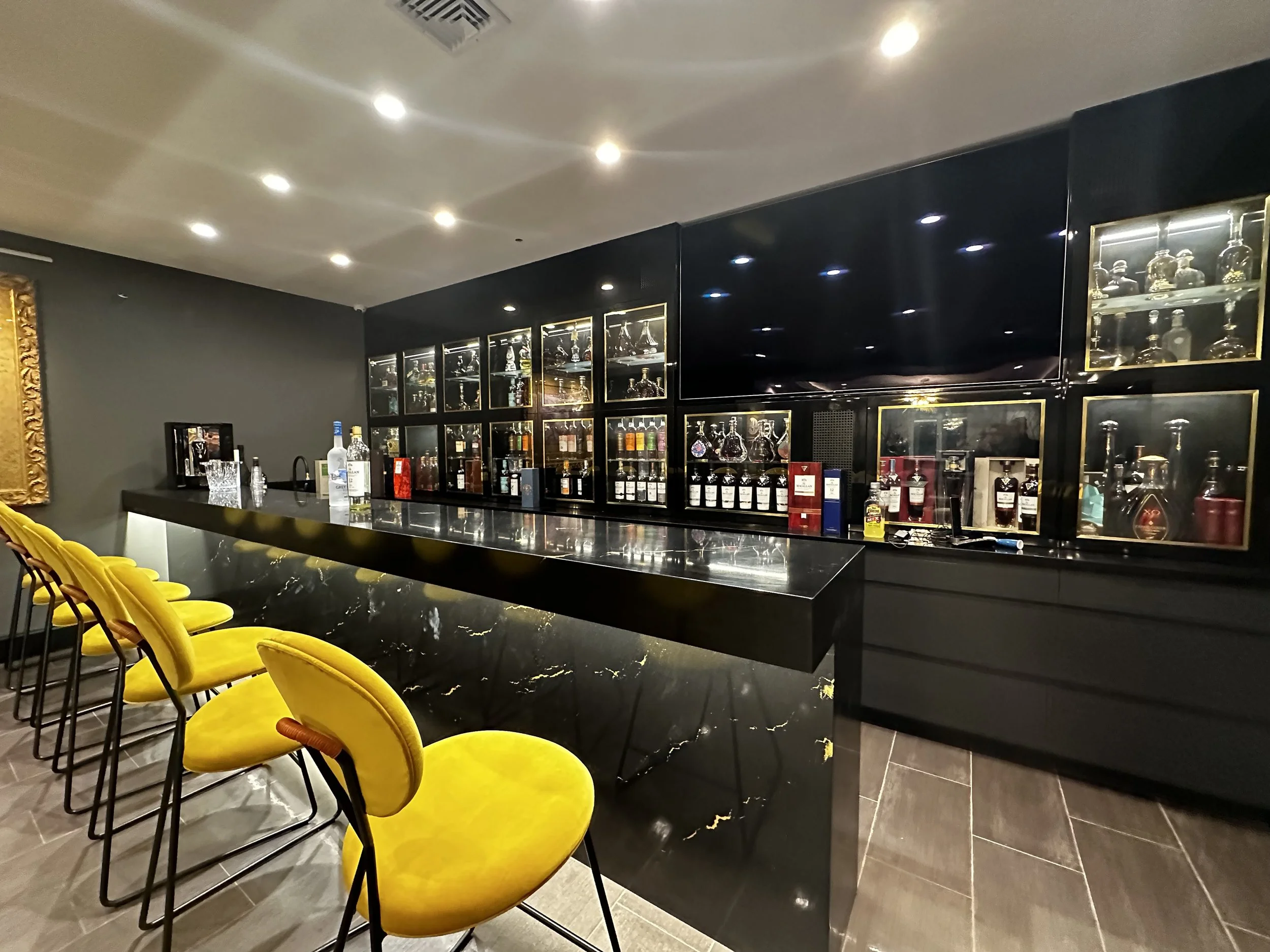 A Great Neck basement bar designed with intention. From the dramatic stone bar front to the illuminated liquor display, every detail was curated to elevate entertaining at home.